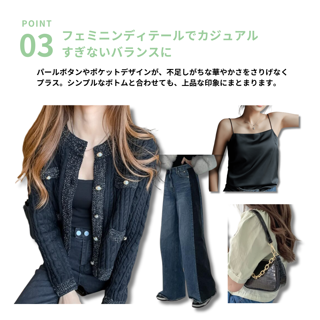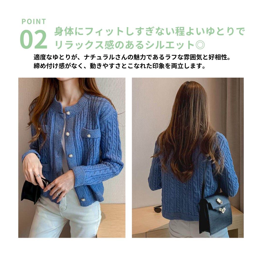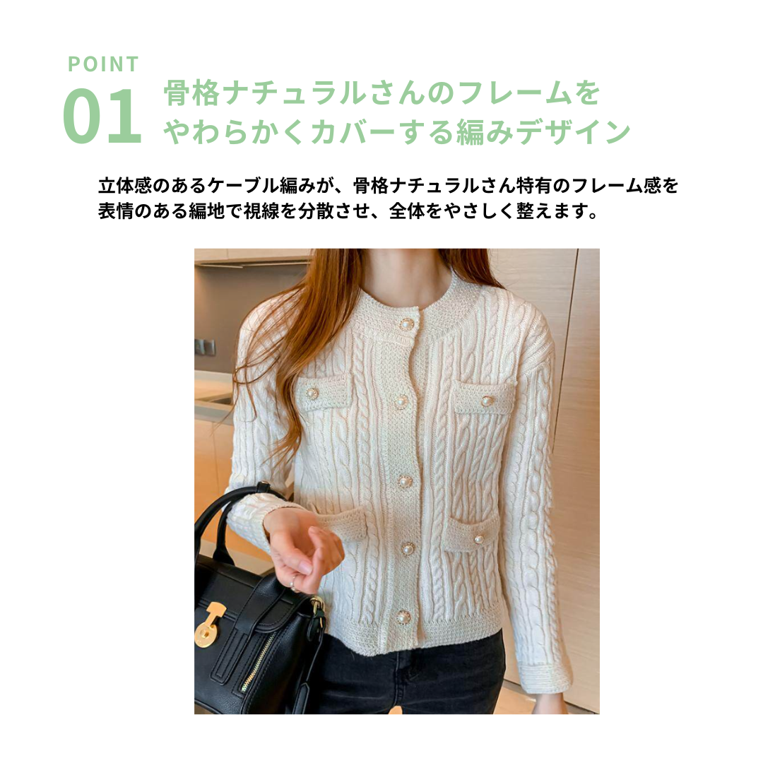 ふんわりとした素材感が魅力のフェミニンニットカーディガンです。骨格ナチュラルさんのナチュラルな雰囲気にぴったりで、ワンピースやスカートとのコーディネートが楽しめます。羽織るだけで女性らしい柔らかな印象を演出します。