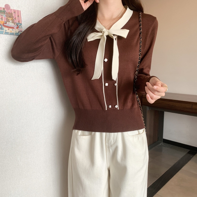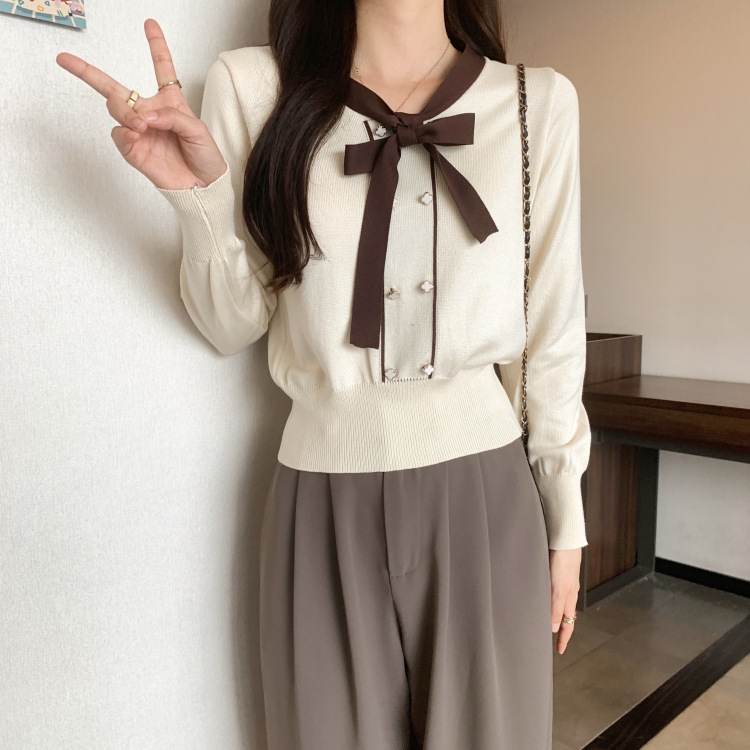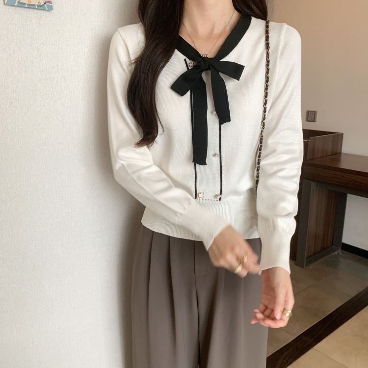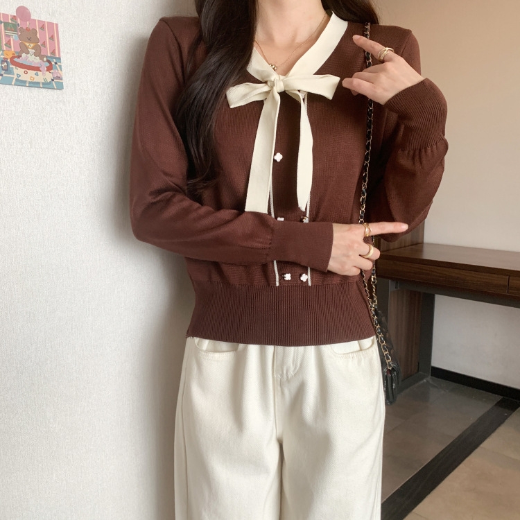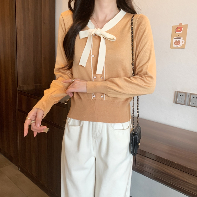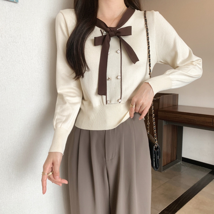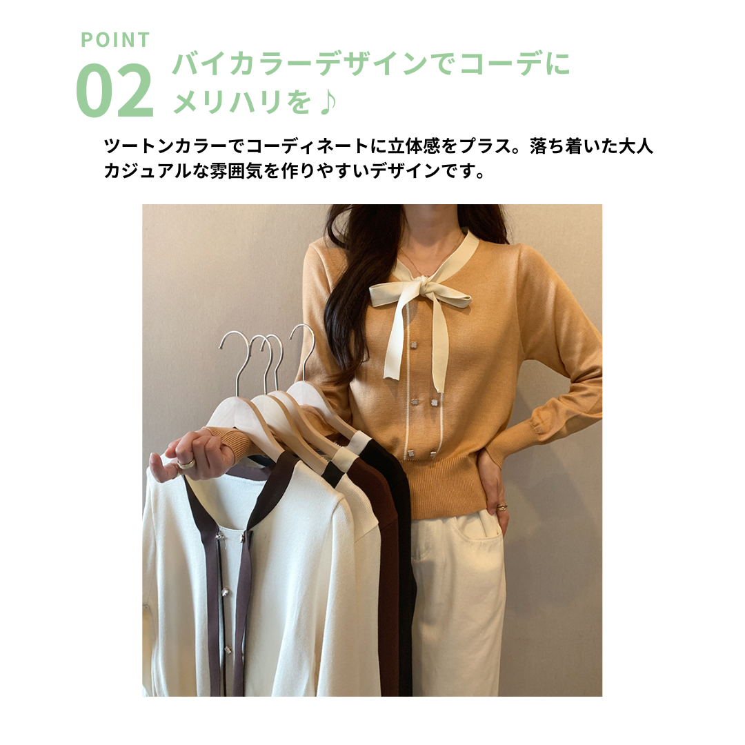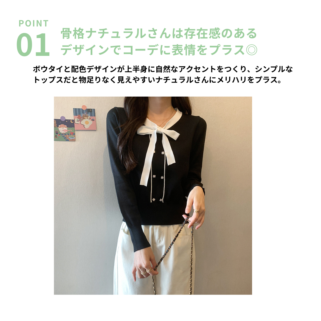 バイカラーのデザインがアクセントのボウタイ付きニットトップスです。きちんと感のあるディテールが骨格ナチュラルさんのカジュアルなスタイルにも取り入れやすく、オンオフどちらにも使いやすい一枚です。