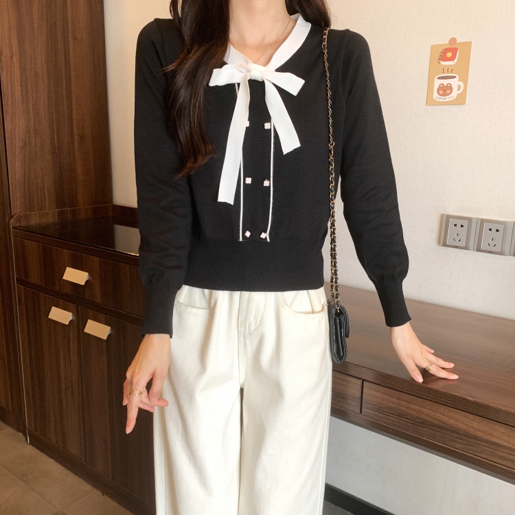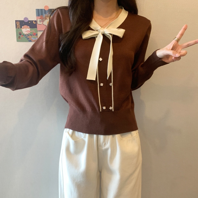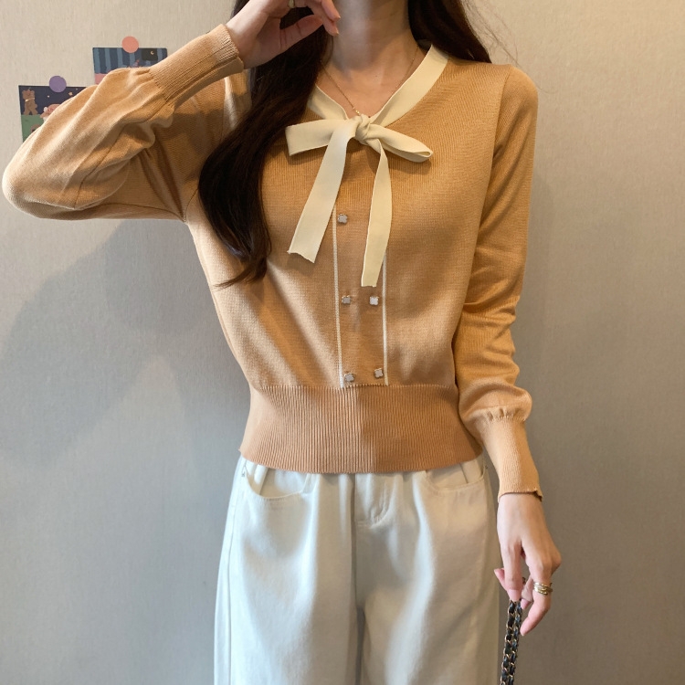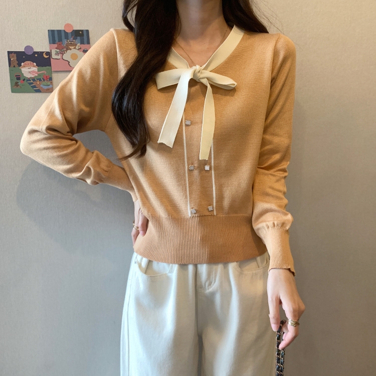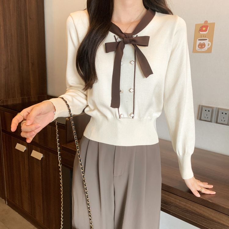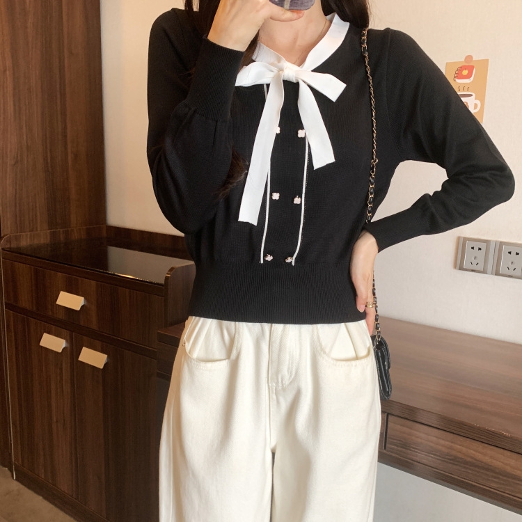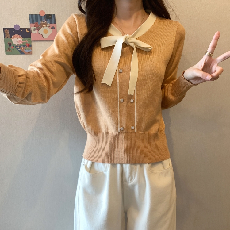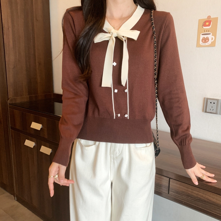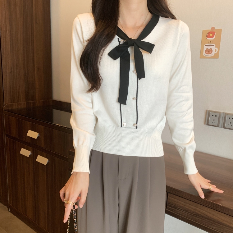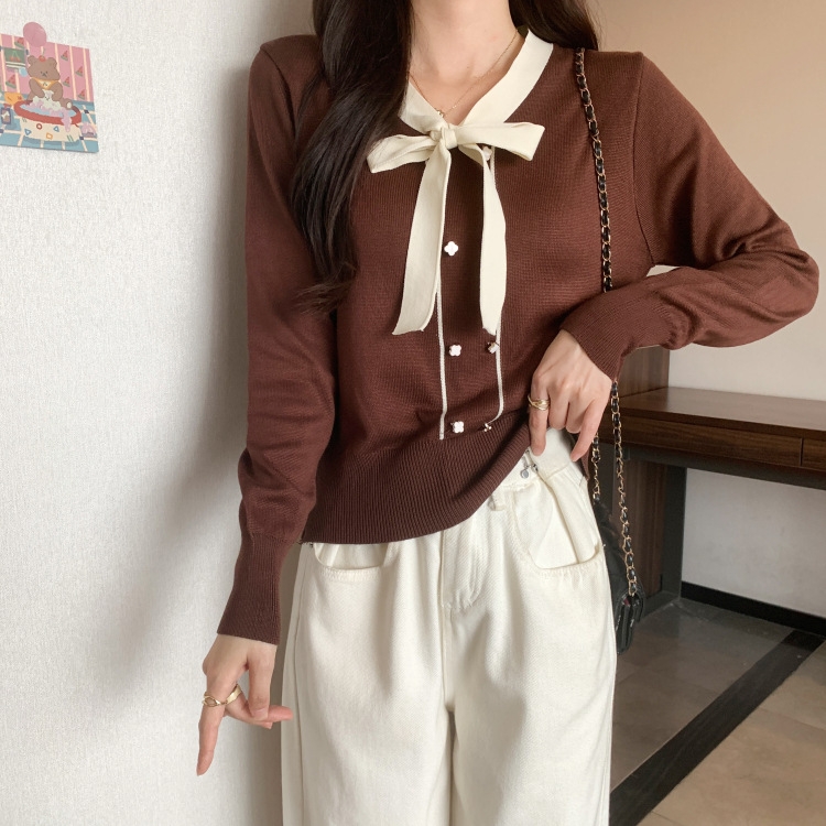 バイカラーのデザインがアクセントのボウタイ付きニットトップスです。きちんと感のあるディテールが骨格ナチュラルさんのカジュアルなスタイルにも取り入れやすく、オンオフどちらにも使いやすい一枚です。