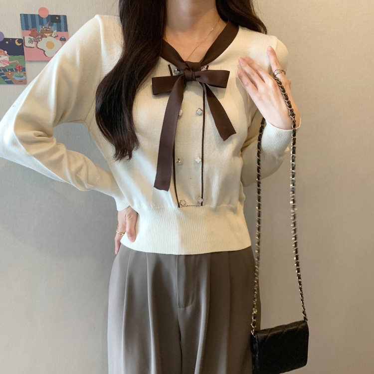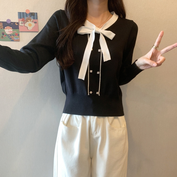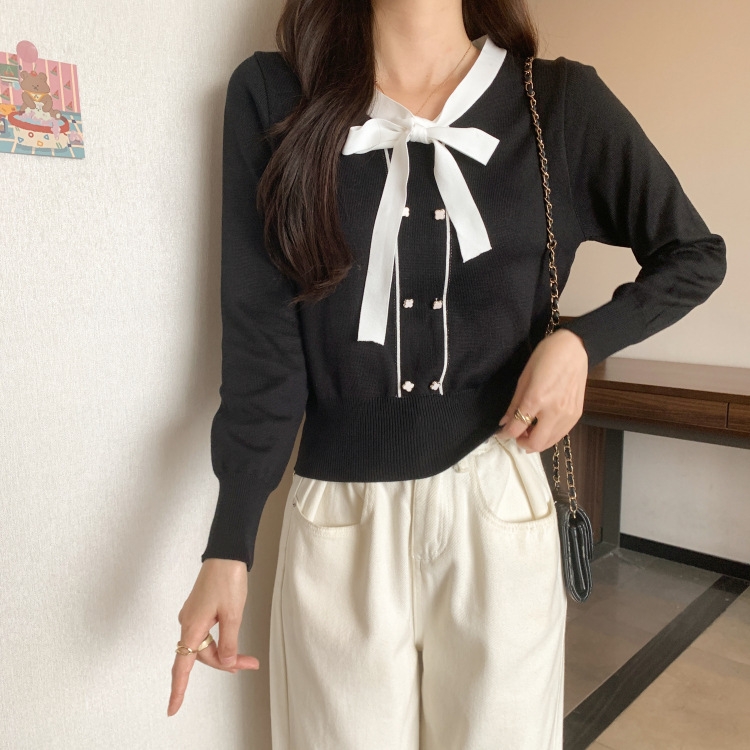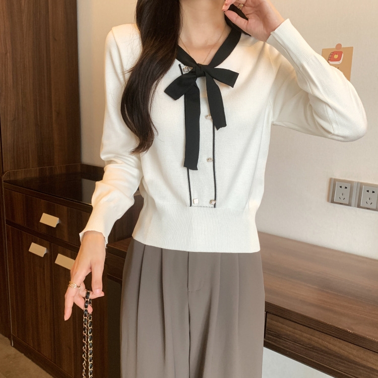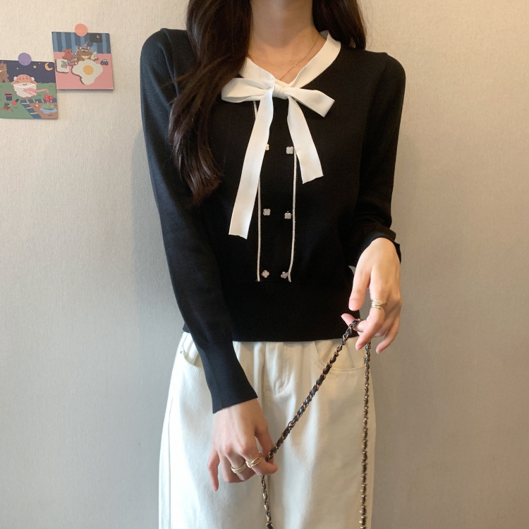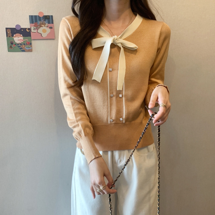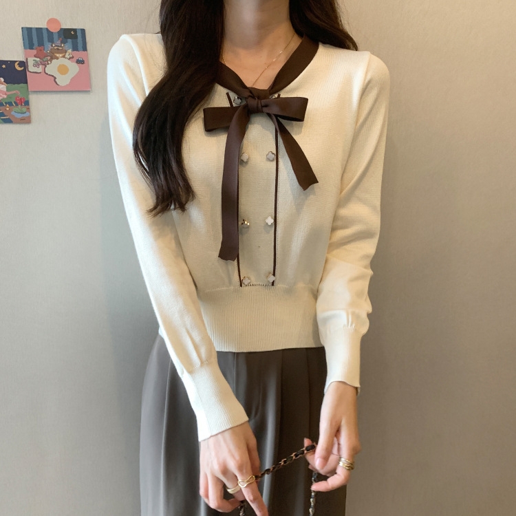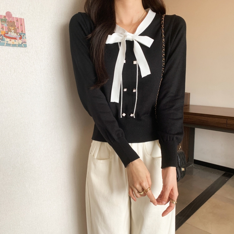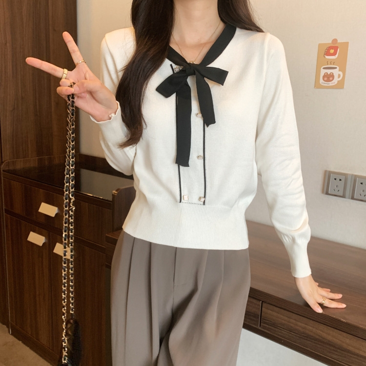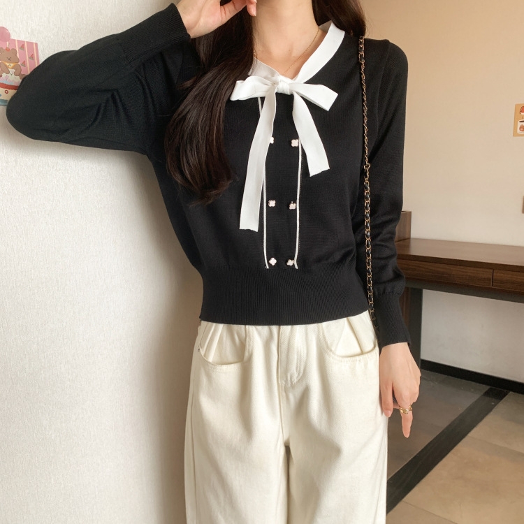 バイカラーのデザインがアクセントのボウタイ付きニットトップスです。きちんと感のあるディテールが骨格ナチュラルさんのカジュアルなスタイルにも取り入れやすく、オンオフどちらにも使いやすい一枚です。