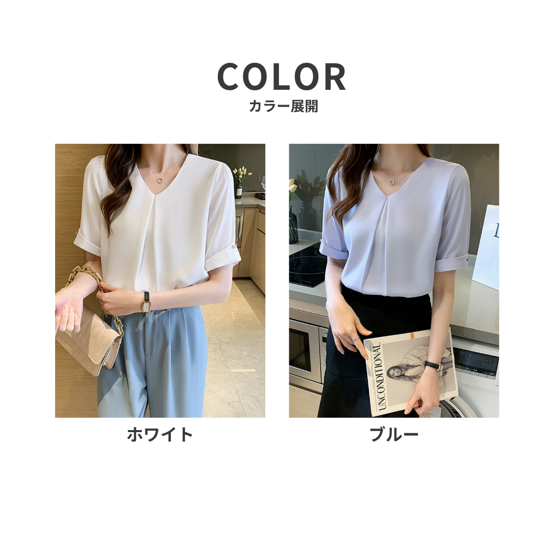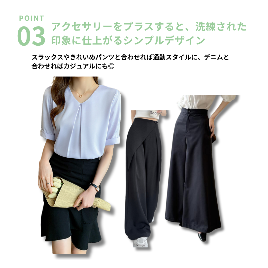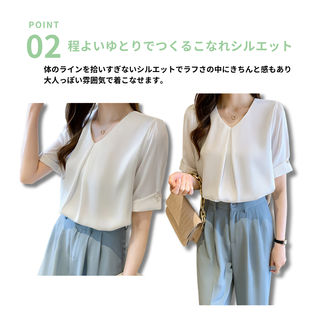 滑らかな素材でオフィスからカジュアルまで幅広く活躍する万能なトップスです。
