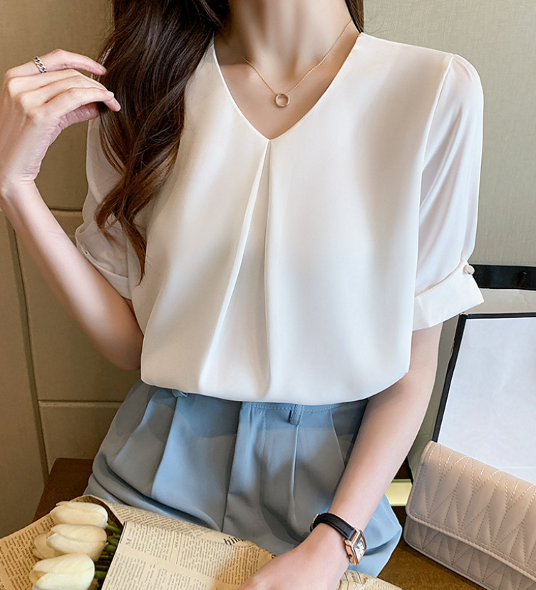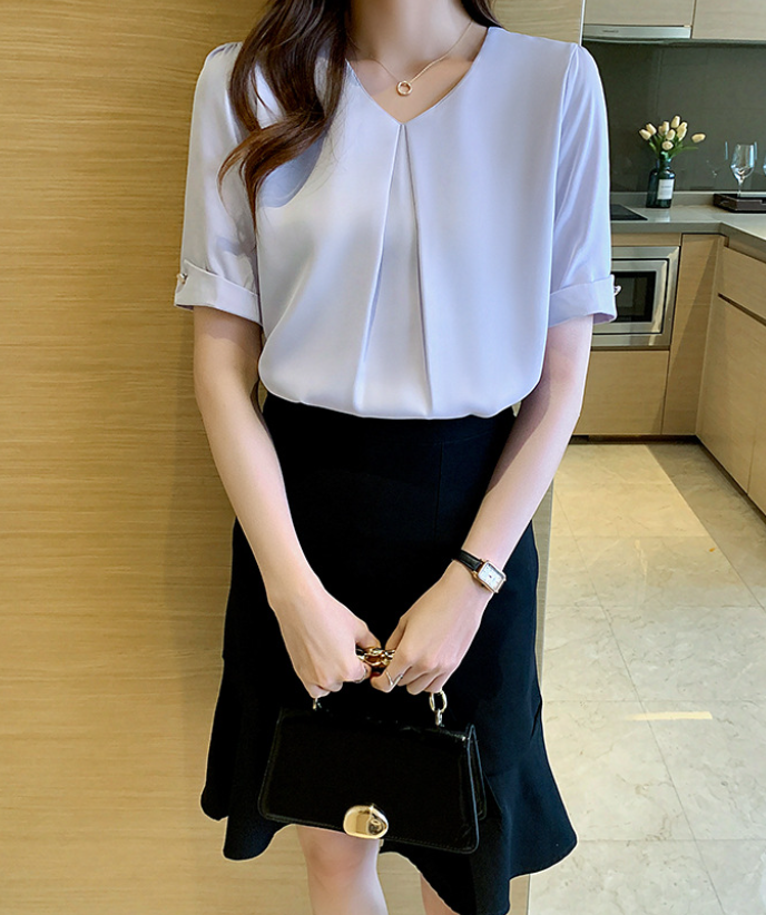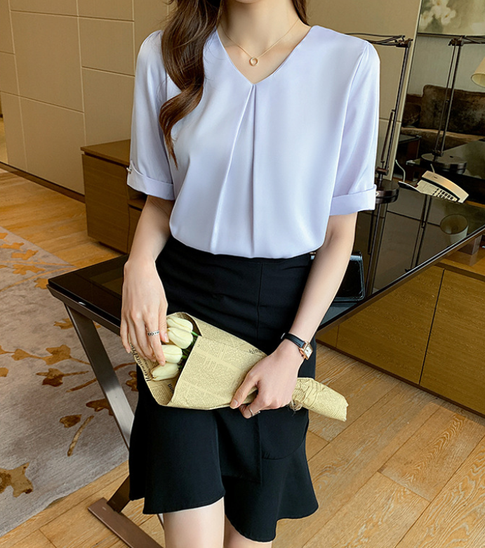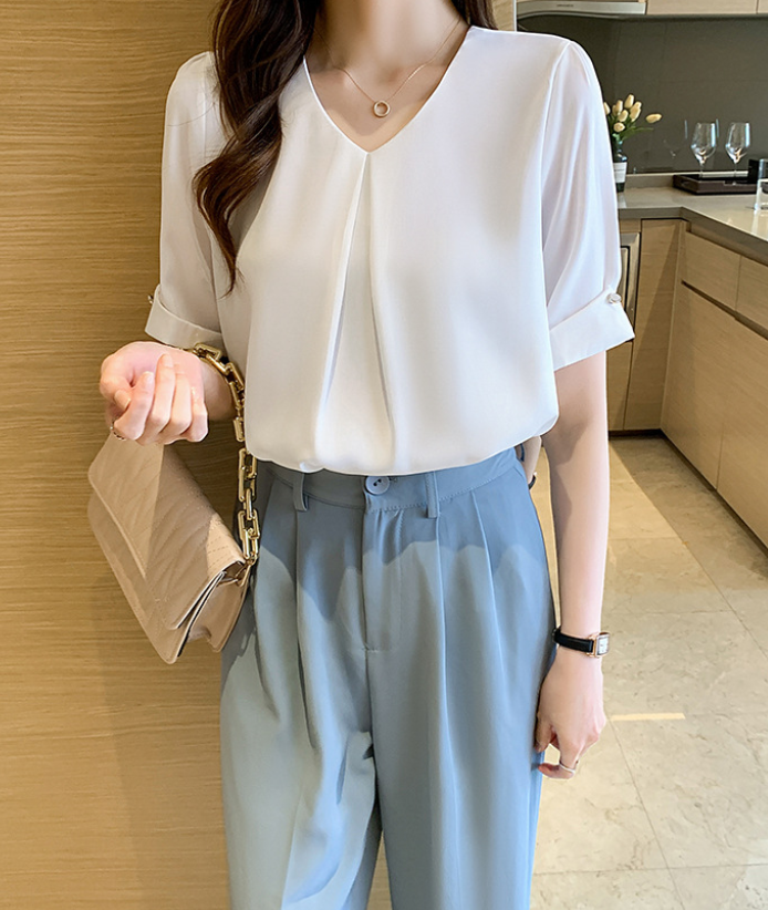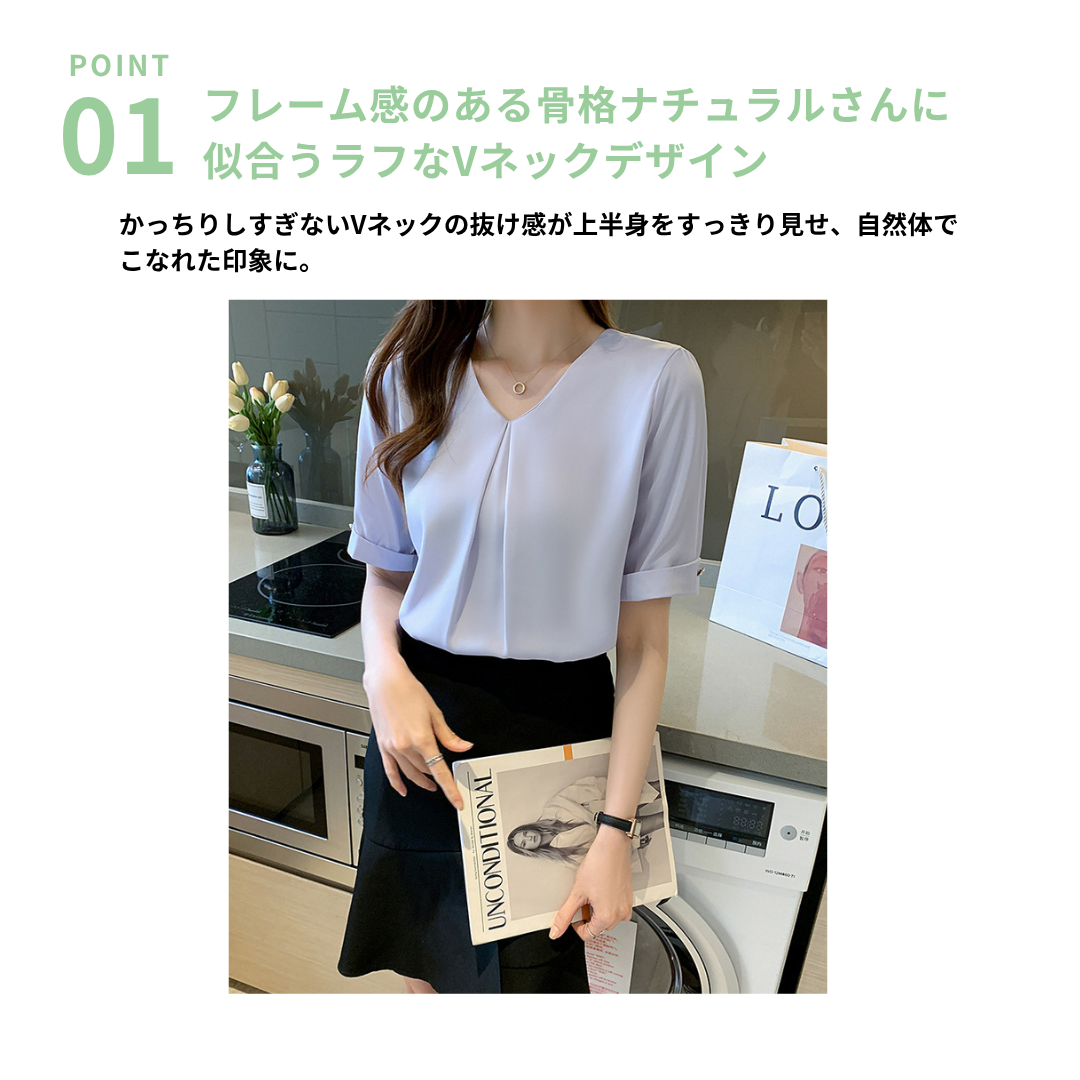 深めのブイネックと中心のタックが縦のラインを強調し、すっきりとした印象を与えます。