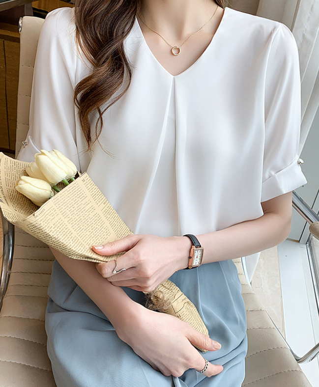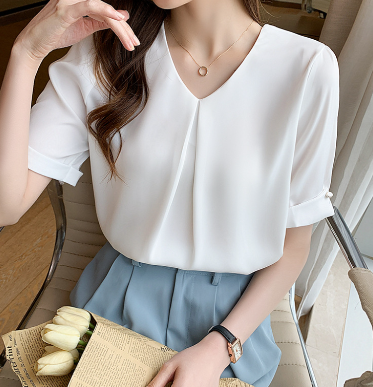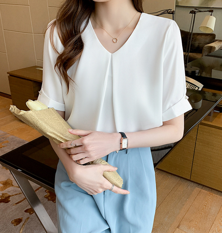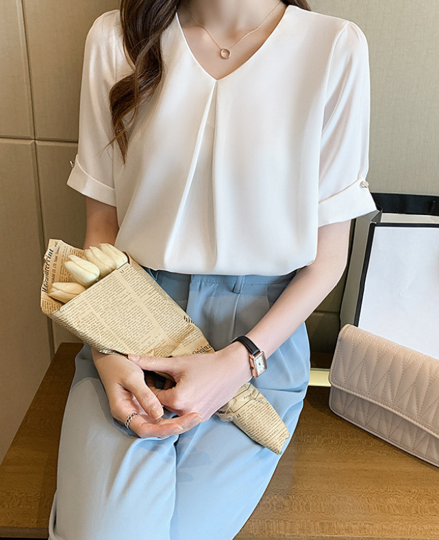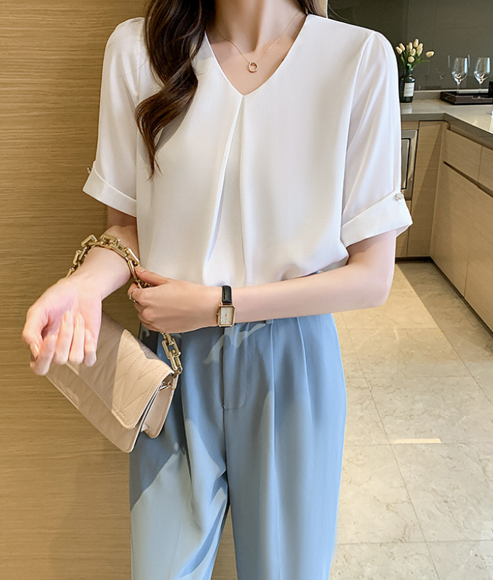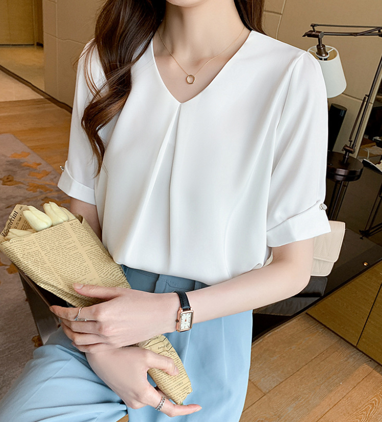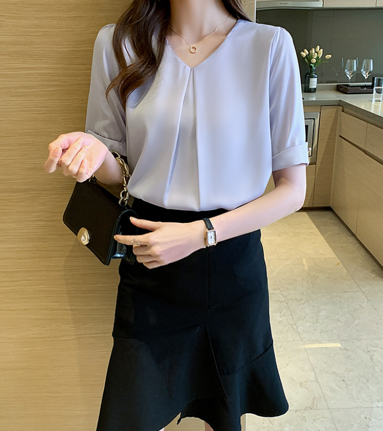 深めのブイネックと中心のタックが縦のラインを強調し、すっきりとした印象を与えます。