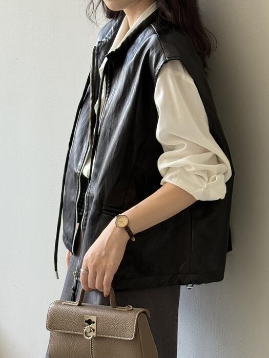 骨格ナチュラルさんにぴったりなオーバーサイズのレザーベスト♡肩まわりやフレーム感を包み込むゆるシルエットで、羽織るだけでこなれ感アップ。裏地のギンガムチェックがさりげないアクセントになり、シャツやワンピとのレイヤードで旬のバランスが楽しめる一着です。